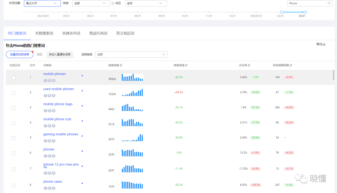 搜索量就是我们选取的品类关键词搜索量的大小。国际站的选词参谋中30天的Smart Phone的搜索热度是712,而Phone的搜索热度是2225。如果我们仅考虑搜索量的话,并且我们销售的是手机,那Phone就非常适合作为品类关键词。但是如果我们销售的只是智能手机,Smart Phone和Phone这两个关键词就都有作为品类关键词的潜质。只要搜索Phone中的人群中有大于32%(2225*32%=712)的人群的实际购买需求是Smart Phone,搜索Phone中的目标客户体量就大于搜索Smart Phone。Phone更加适合作为品类关键词,反之,Smart Phone会更加适合。但是实际情况是,我们无法判断每个词中对特定产品需求的真实比例,只要是搜索量相对较高的词都可以用来做品类关键词。