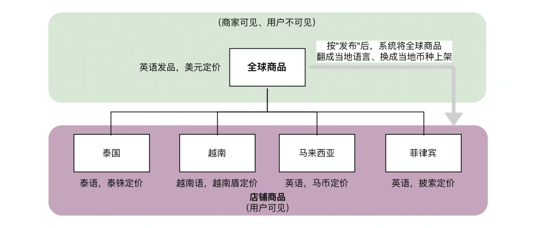 "全球商品"可发布到各站点(e.g. 英国站、泰国站)下成为"店铺商品",系统会将商品翻译成站点当地语言,计算出店铺价格(考虑货币换算、税率计算、物流成本加入到售价等因素),商家也可自行修改店铺商品的价格。