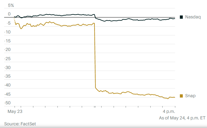 5月24日,社交媒体公司Snap因下调业绩预期导致股价暴跌43%,创下了有史以来的最大当日跌幅。从而引发了市场对互联网以及数字广告行业的广泛担忧。