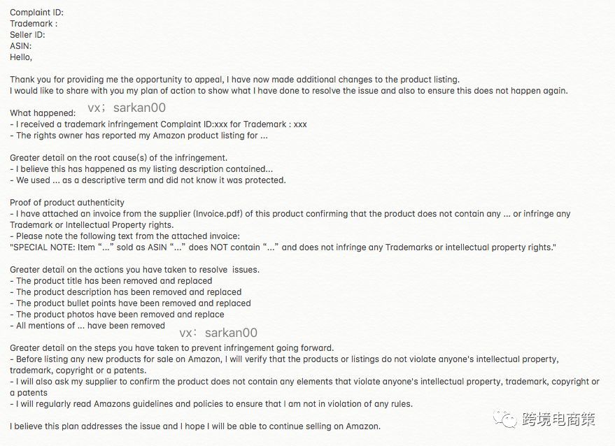 第一种如果你是侵权了别人的商标导致你的账号被封,该情况亚马逊也会封你账号,并且会让你写一份你以后的plan of action,你收到亚马逊的这封信件【具体亚马逊给你发的邮件我在这里就不说了】时不要立马就回信,先等等12-24小时,然后在回复: